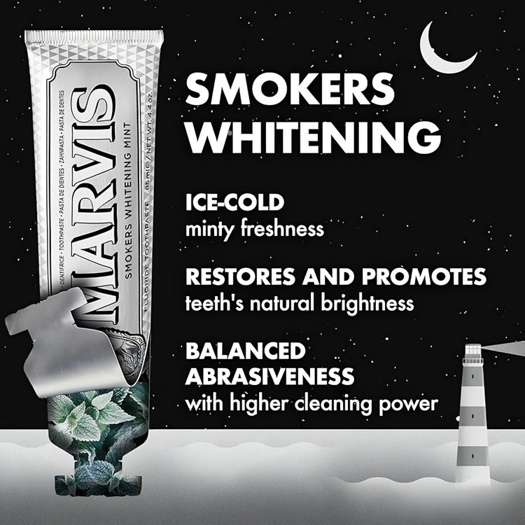 حاوی گلیسیرین، سیلیس هیدراته، زایلیتول، دیاکسید تیتانیوم، سدیم فلوراید، منتول، روغن نعناع فلفلی، لیمونن و روغن پوست پرتقال